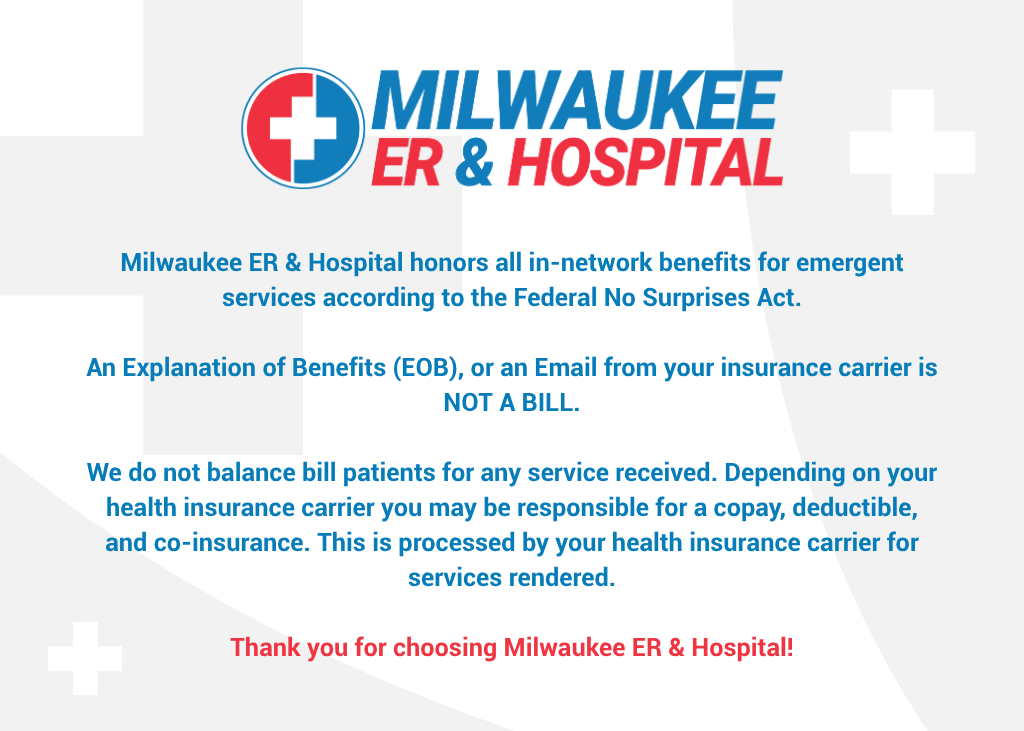 Milwaukee ER & Hospital complies with EMTALA regulations and provides medical screening examinations to all patients, regardless of insurance status. While we are not currently contracted with commercial insurance plans, federal law requires insurers to cover emergency services at in-network rates when the visit is considered emergent. As a patient you are responsible for your Emergency Room copay, yearly deductible, and coinsurance per the benefit plan provided at the time of service. We comply with the federal No Surprises Act of 2022.